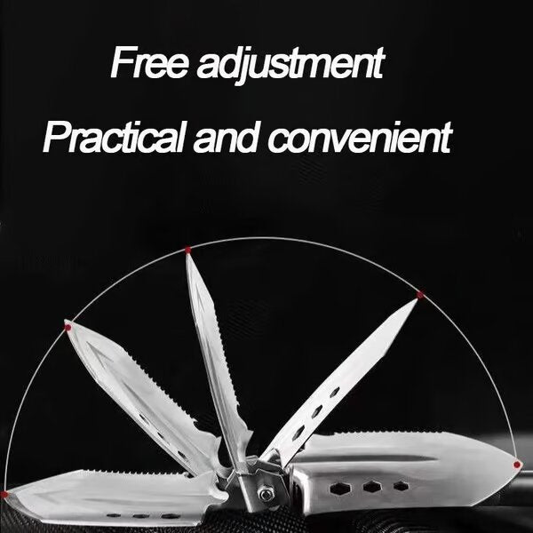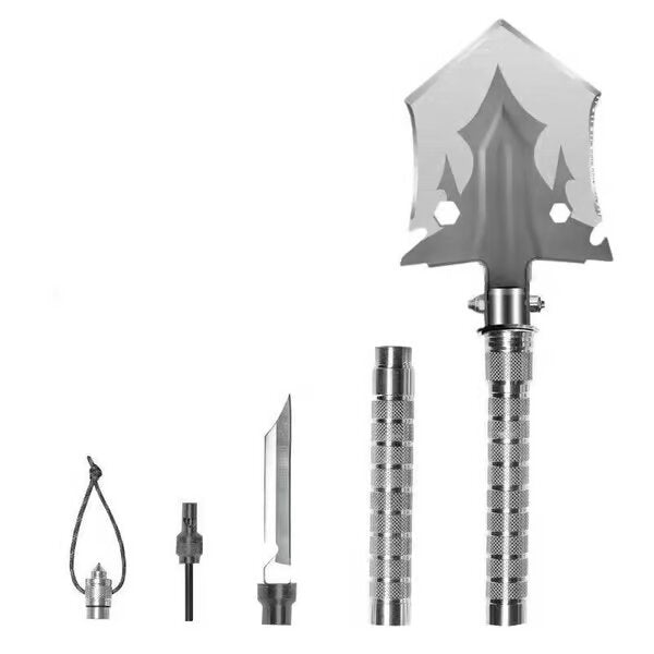 - Pala multifuncional : esta pala plegable incluye un hacha, un destornillador hexagonal, un picapiedra, un cuchillo de sierra, un cortador de alambre, una azada, un arpón, una sierra, un cuchillo de rescate, un abridor de botellas, un martillo de seguridad, una broca Phillips y una broca de cabeza plana. Estas funciones le asegurarán que sobreviva al acampar en cualquier situación.